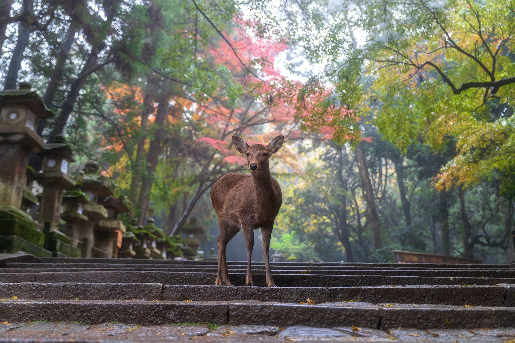 Une biche à Nara se dressant fièrement dans les escaliers.